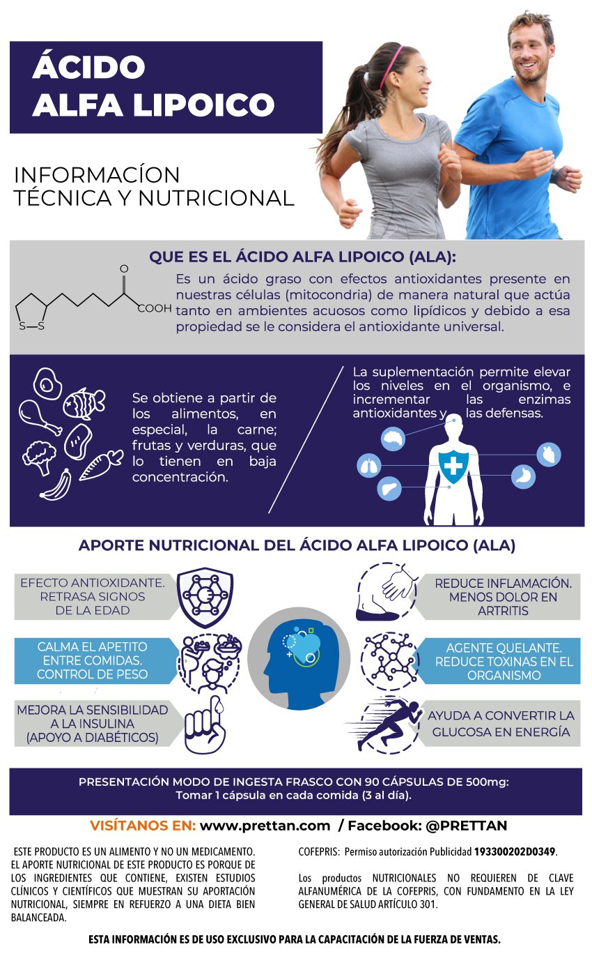 Tiene la excelente propiedad de ser soluble tanto en agua como en grasa, lo que le hace marcar la diferencia con el resto de antioxidantes que suelen ser solubles en agua o en los tejidos grasos, pero no en los dos a la vez. De esta forma el ALA puede llegar a todas las partes del cuerpo humano, disolverse y llegar hasta capas profundas de los nervios y tejidos orgánicos, haciendo de este uno de los antioxidantes más efectivos.