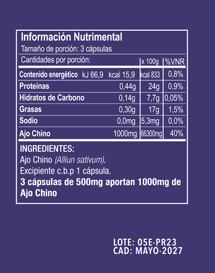 Tomar 1 cápsula en cada comida (3 al día) (la ingesta de 3 cápsulas de 500mg aportan 1000 mg de Ajo Chino).