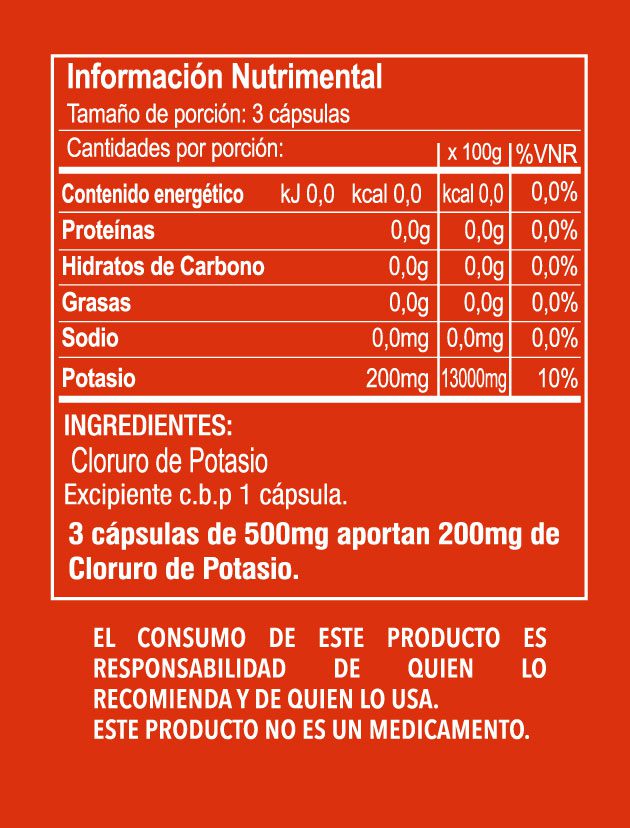 Cloruro de Potasio. Excipiente c.b.p. 1 cápsula de 500mg. El cloruro de potasio es un compuesto químico formado por el Potasio y el Cloro. El cloro, unido al Sodio y al Potasio, mantiene el control osmótico regulando la cantidad de agua en el organismo y actúa en las funciones del sistema nervioso y contracción muscular. El Potasio, junto con el Sodio, actúa en la contracción muscular, en la conducción nerviosa y en el equilibrio de fluidos en el organismo. Es del tipo electrolito, que sustituye al mineral potasio perdido por motivos involuntarios. El cloruro de potasio elevará el nivel de potasio en el organismo para que el correcto funcionamiento de los músculos, el corazón y otros órganos.