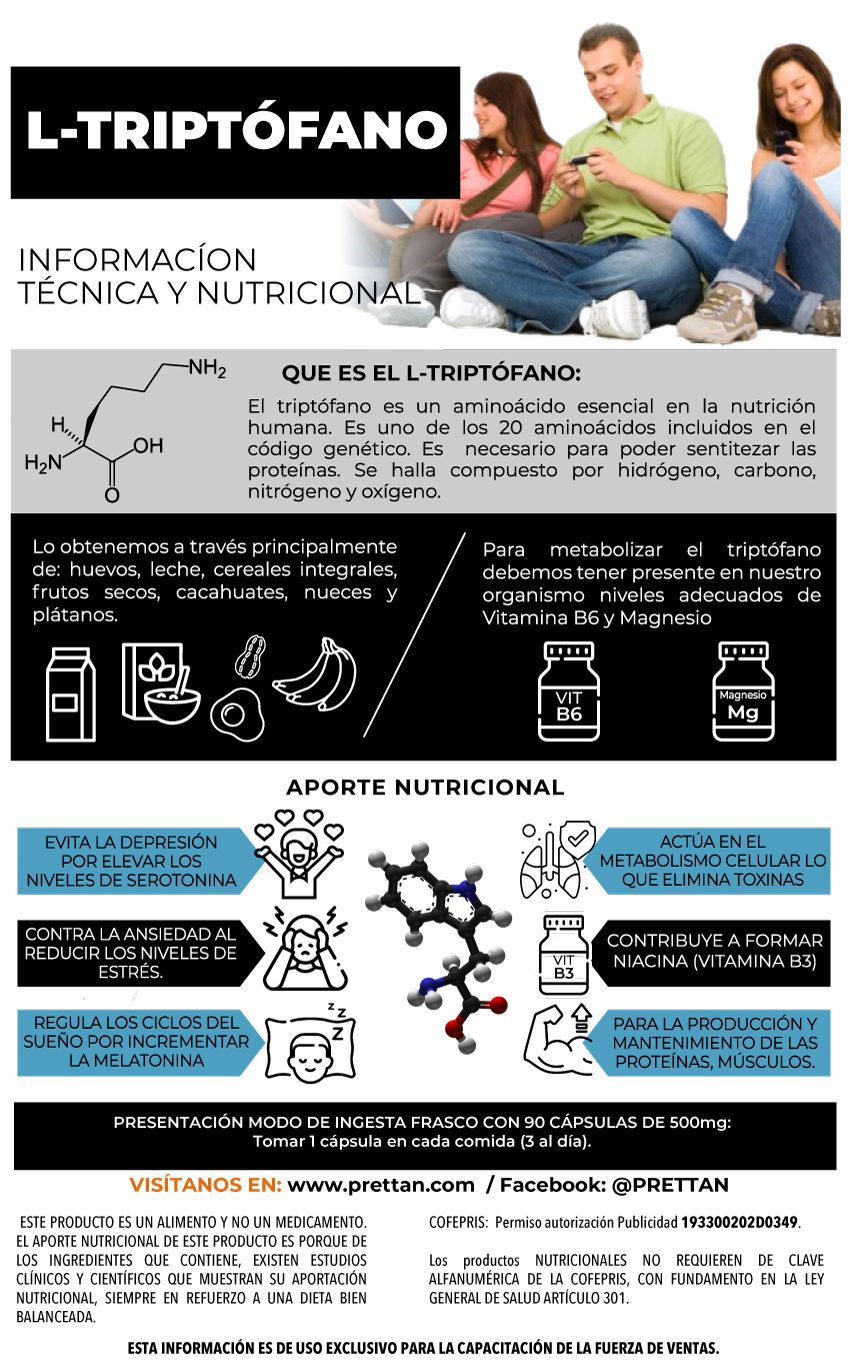 El triptófano es uno de los 8 aminoácidos esenciales de la dieta humana. Este es el precursor metabólico de la serotonina, melatonina y niacina.