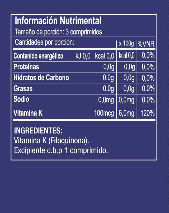 Vitamina K (como Fitonadiona). Excipiente c.b.p. 1 comprimido de 500mg.